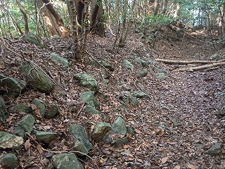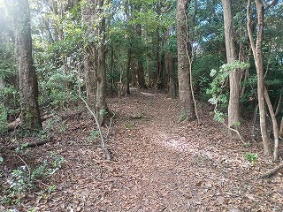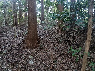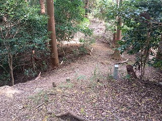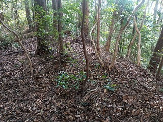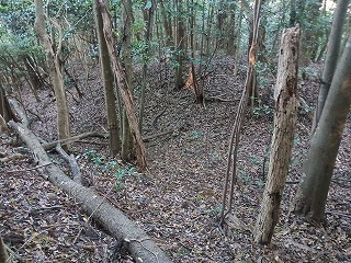 南北朝時代の山城には昔から憧憬があり、今回の三岳城もとても楽しみだった。そのせいか登山の途中からアドレナリンが充満して、それまで引きずっていた疲れはどこかへ吹き飛んでいたように思う。画像は明るく見えるが午後3時を過ぎているので実際にはかなり暗い。慎重に足元を確かめつつ登っていくと鞍部の堀切へ着いた。