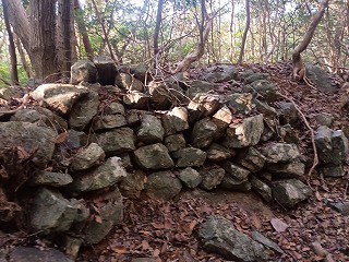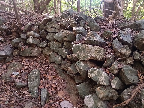 もうひと踏ん張りしようと西へ下ると帯曲輪が三段ほど連なるが、いちばん西端に位置する土塁には予想していたよりも立派な石積が施されていた。ここでまたアドレナリンが噴出して土塁の上を駆け回った。ひと通り石積の美を楽しんだあとは再び主郭へと戻り、岩にしがみつくようにして腰を下ろし休息を取った。疲れが一気に放散されたような感じだったが、風景の美しさに励まされ、訪ねるつもりのなかった東の曲輪群へ向かった。
