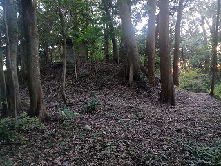 画像では明るく見えるが実際には肉眼での観察が難しいほど暗い時間帯である。往路ではある程度見えた土橋も帰りは真っ暗でほとんど見えない状態だった。とりあえず主郭へと急ぎ、案内板の地形を頭に叩き込んで二の郭へと向かったが、大土塁の迫力は暗い中でもよくわかった。さらに進むと土橋を伴う堀切が残り、その向こう側には縄張図に表記はないが三の郭となる。ここまで着いたときにはもう漆黒の闇だった。