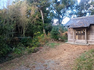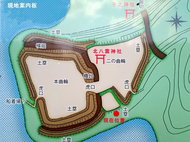 道路に面した北八雲神社の境内となっているのでわかりやすかった。参道の脇に案内板が設置されているが、主郭の南面は茶畑の開墾で旧態を留めていない。神社の社殿がある二の郭の東半分はとても立ち入れないような藪だった。土橋が架かる空堀はおそらく湿地を利用した泥が堆積していたと思われ、実際に堀底へ降りて歩いてみると靴が足首まで泥に埋まった。