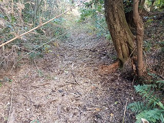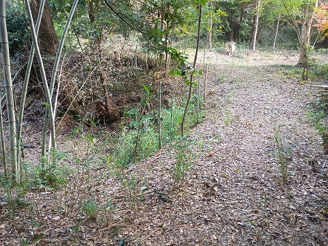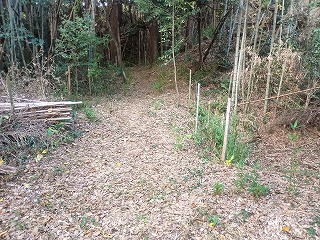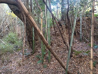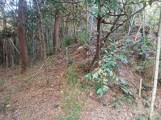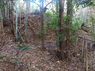 主郭も虎口の土塁こそ立派だが、まともに見学ができるのは虎口周辺のみであり、あとは竹と雑木が密集して踏み入るのは事実上不可能に近い状態である。せっかくの遺構もほとんどが藪に埋もれてしまっているのは残念だが、地方の土豪の城が大勢力によって改修されたであろう姿を垣間見ることができたのは収穫だった。 |