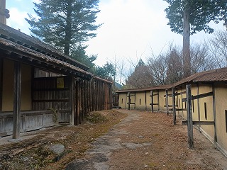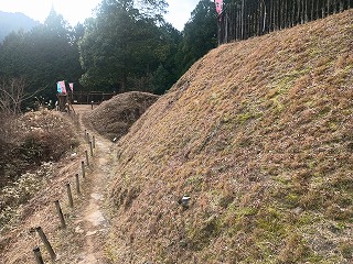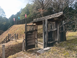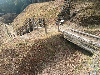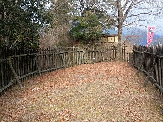 狭隘な曲輪に建物が建ち並ぶ様子は往時を垣間見せてくれるようだった。搦手の門を潜って堀切を越えて二の曲輪へ立つ。ここにも木の柵が並べられて簡素な山城の雰囲気を高めてくれる。鋭角な堀切を隔てて三の曲輪が配置され、その向こうには迫力満点の二重堀切が尾根を断ち切っている。岩盤を削り取った大規模な普請は武田氏の手によるものだろう。