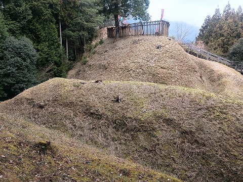 城山の中腹にある駐車場からの比高差は、およそ百メートルほどであろうが道は険しく急傾斜だった。それでも足取りは軽く、胸の高鳴りを抑えることができないまま、山頂にある本曲輪を目指した。大手の腰曲輪から登り詰めると、高根城の象徴とも言える井楼櫓が視界に飛び込んできた。