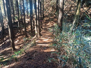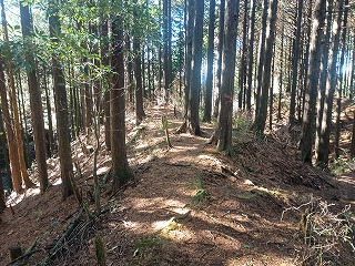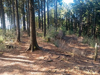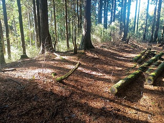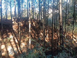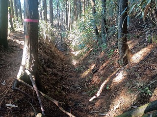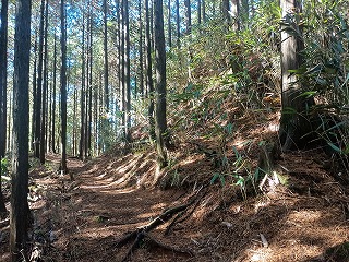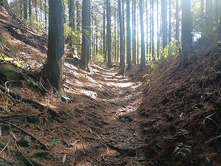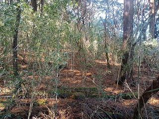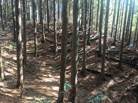 古道は歩きやすく、箱根峠城へは下るだけなので楽だった。5分ほども歩いたぐらいで土橋が現れて城内へ入ったことがわかった。案内板もなく一部は藪化しているが、想像していた以上にはっきりとした城郭遺構が確認できる。二重堀切は残念ながら藪に埋もれていたようで確認できなかったが、堀底道のような古道と削平された曲輪と土塁、しっかりとした土橋を見られただけでも満足感は高かった。 |