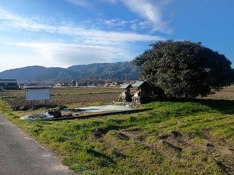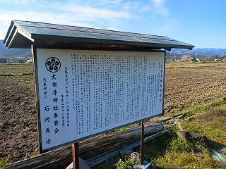 大岩手神社には岩手氏の歴史を綴った案内板が設置されているが、このあたりも含めた一帯が岩手弾正館と推定される。農道が館跡の真ん中を貫いているようで、周辺の土地の起伏を観察しても館跡の姿を連想することは難しかった。 |
