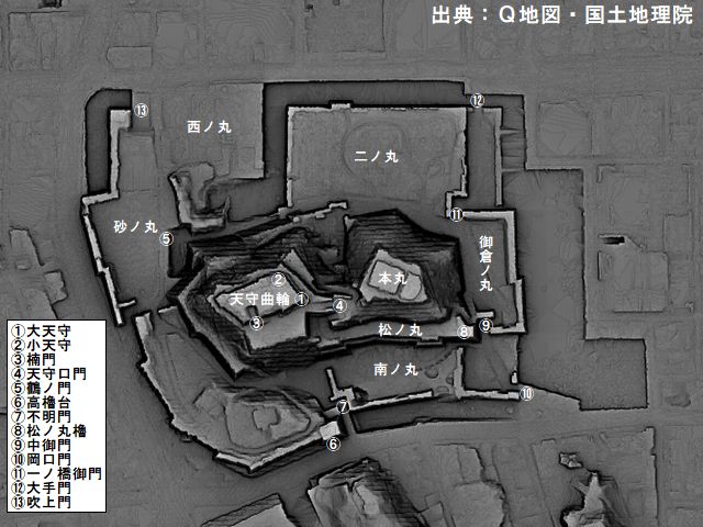 弘化3年(1846)の落第で浅野氏時代の天守は焼失したが、御三家の居城であった和歌山城は天守の再建が許可された。明治4年(1871)に廃城となるも天守や城門などは取り壊されることなく保存されたが、昭和20年に米軍の空襲によりほとんどの建造物が焼失した。戦後の昭和33年に天守や城門が再建されて現在に至る。 |