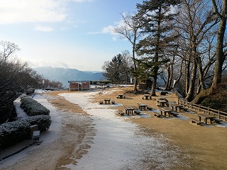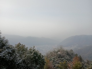 初日は快晴に恵まれ、二日目の予報も上々だったので安心して眠りについたが、アラームで起床して窓を開けるとちらほらと雪が舞っていた。ずいぶん昔に新潟の坂戸城へ登ったときと同じで、遠くへ目をやると民家の屋根がうっすらと雪化粧をしている。暗澹たる気持ちで朝食を済ませてホテルを出たが、思ったほど道路の状態は悪くないので、何とかなるだろうと思い麓へと向かった。とのかくここまで来たら後戻りもできないので覚悟を決めての登山である。