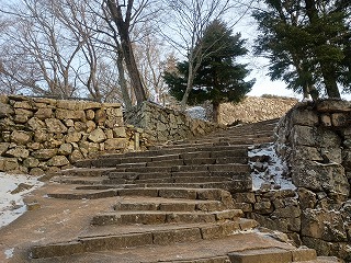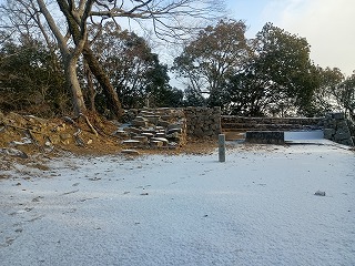 最短距離を歩きたいので登山道を選択したが、けっこうな距離である。ふいご峠でひと休みしたが、駐車場の管理人にまだ半分ぐらいと言われた。とのかくここまで来ればあと一息なので、もうひと頑張りして登ったが、途中に中太鼓ノ丸の遺構があるので思ったよりも近く感じた。さらに登ると真田丸のオープニングに使われた岩盤が現れたが、これを見ただけで一気に気分が高揚する。ここからはもう雲の上を歩くかのようにふわふわした気持ちで天守まで駆け上がった。雪のせいか自分が早く来すぎたのか、一番乗りを果たすこととなり、どっしりとした天守との対面を迎えた。
