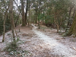 雪が舞い散る備中松山城の遺構を存分に味わったあとは、うっすらと雪が積もった山道を縦走して大松山城を目指した。幸いにして朝方から降り出した雪は粉雪であり、泥濘となることもなく足元に注意をしつつ難なく大松山城へと到着した。