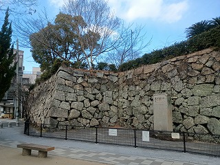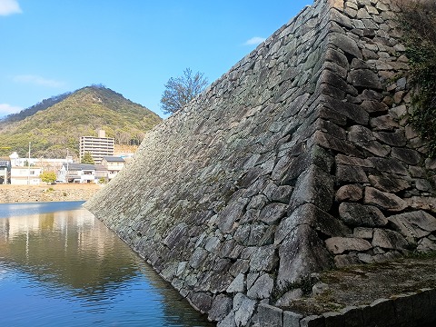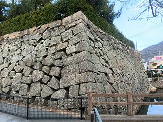 駅の南側には中門跡と臨海一番櫓の石垣が残っているが、復元された石垣のようにも見える。湾岸の埋め立てによって海からかなり遠くなっているが、船入櫓跡の石垣もまた見事だった。こちらは長年の風雪により石垣に歪みが見られるので、できれば早急な修復工事が望まれる。完全に市街地に没した三原城であるが、石垣の迫力から往時の偉容が感じられた。 |