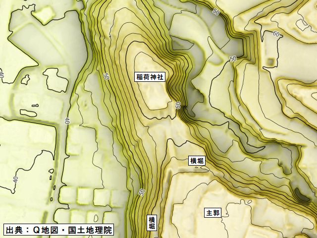 台地上は農地が大部分を占め、中心と思しき場所には密蔵院があるが、全体的に遺構は消滅しているようだった。集落の北の外れにある稲荷神社は空堀に架かる土橋を渡った場所にあり、言うなれば独立した曲輪を形成している。ひっそりとした境内には松平城の案内板が設置されている。台地の縁に横堀や断片的に土塁が見られるが、往時を偲ぶにはやや物足りない印象を受けた。 |