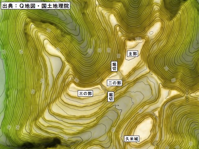 竜貝城は久米城の別曲輪であるが、現地の図面を参照しても主郭や二の郭といった表記があり、谷を挟んで独立したような立地なので久米城とは別々に扱うこととした。